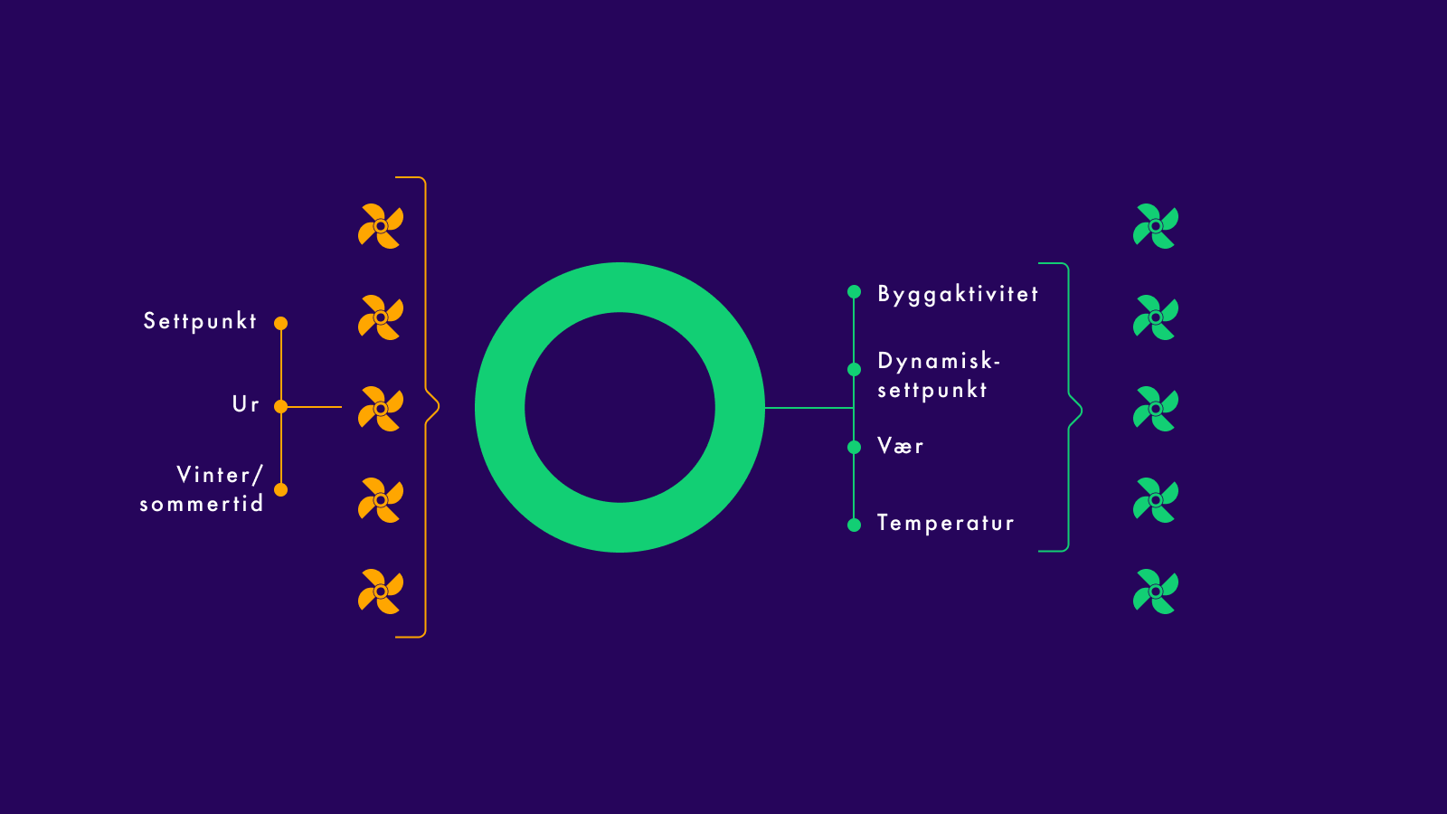 Eksempelet viser hvordan Properate muliggjør styring etter faktiske behov selv basert på enkel lokal automatikk. Videre hvordan kunden på denne måten oppnådde betydelige besparelser i nybyggkostnad og energiforbruk.